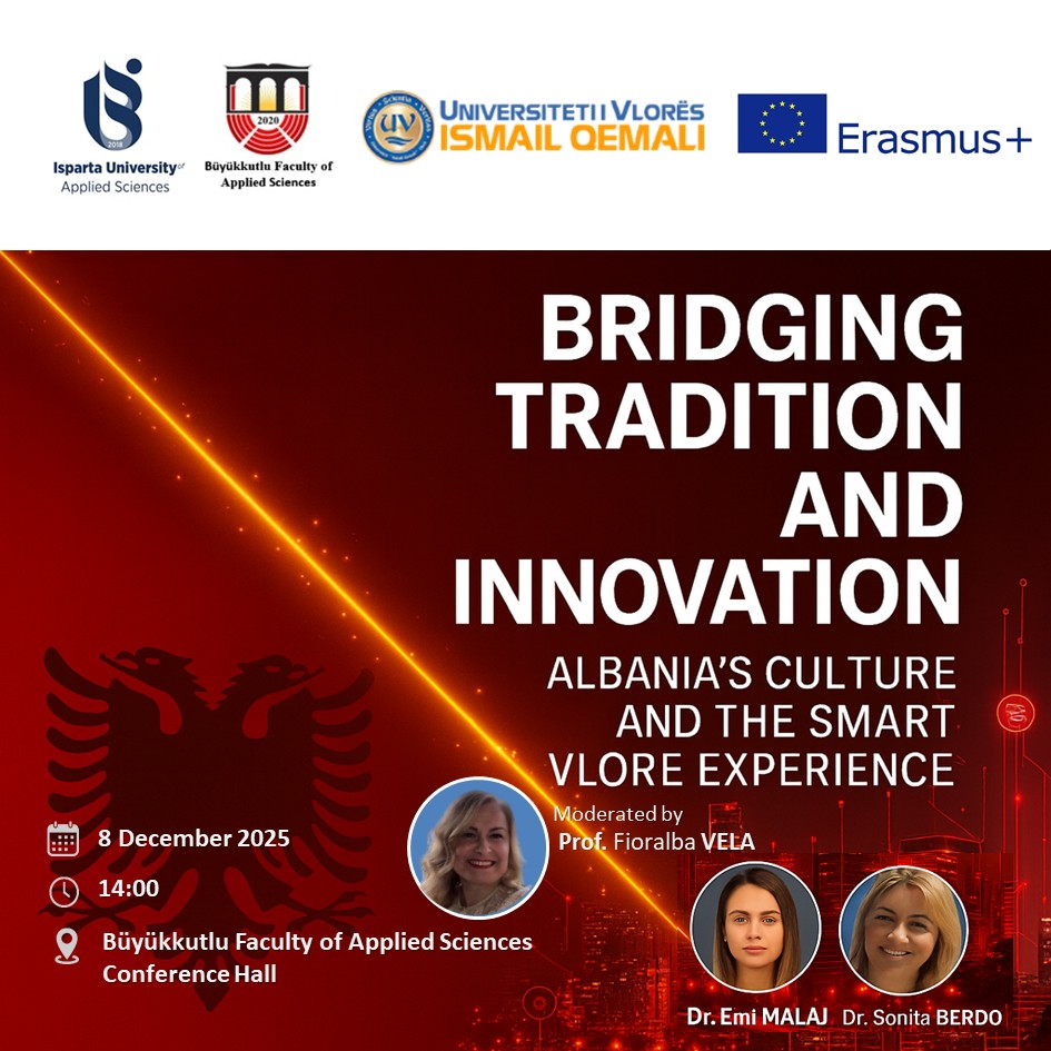 Fakültemizde, Erasmus+ kapsamında Universiteti i Vlorës Ismail Qemali ile ortaklaşa "Bridging Tradition and Innovation: Albania’s Culture and The Smart Vlore Experience" başlıklı bir panel gerçekleştirilecektir.