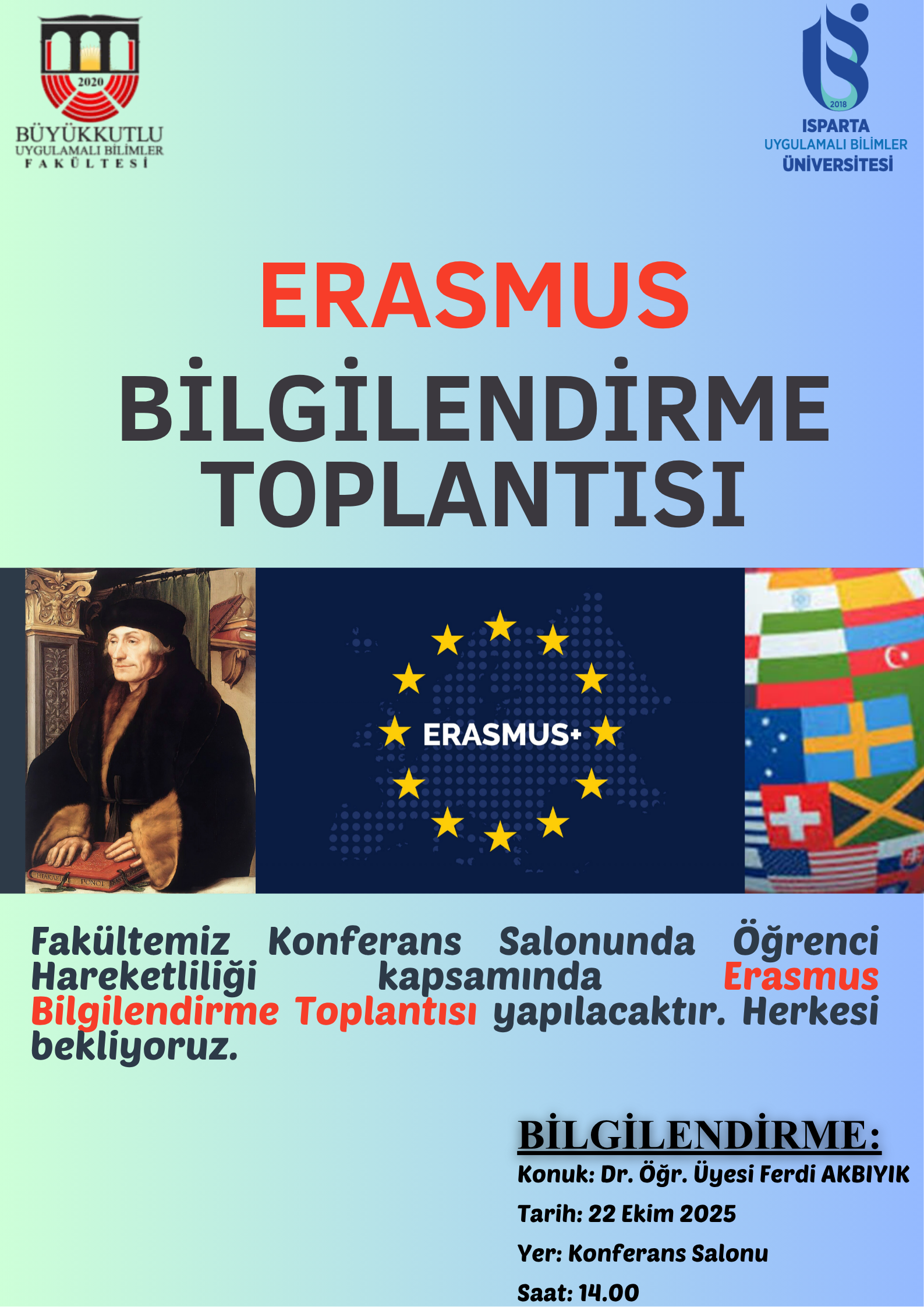Gelişen ve değişen dünyamızın artık globalleşmesi neticesinde öğrencilerimizin bahsi geçen dünya değişimlerine adaptasyonu oldukça önemlidir. Bu nedenle fakültemizde; "Erasmus ve Öğrenci Hareketliliği Hakkında Bilgilendirme" toplantısı gerçekleştirilecektir. Siz değerli öğrencilerimizin yeni yerler keşfederek farklı kültürler ile bakış açınızı değiştirmenize olanak sağlayacaktır. Bu fırsatlardan yararlanmanız açısından bilgilendirme toplantısı önemlidir. Tüm Bankacılık ve Sigortacılık Bölüm öğrencileri davetlidir. Bilgilendirmeler fakültemiz Şehit Er Süleyman KALKAN Konferans Salonunda, saat:14.00'da, 22.10.2025 tarihinde gerçekleşecektir. Gerekli bilgilendirmeler, Dr. Öğr. Üyesi Ferdi AKBIYIK tarafından yapılacaktır. Katılımlarınız için şimdiden teşekkür ediyor, çalışmalarınızda başarılar diliyoruz.