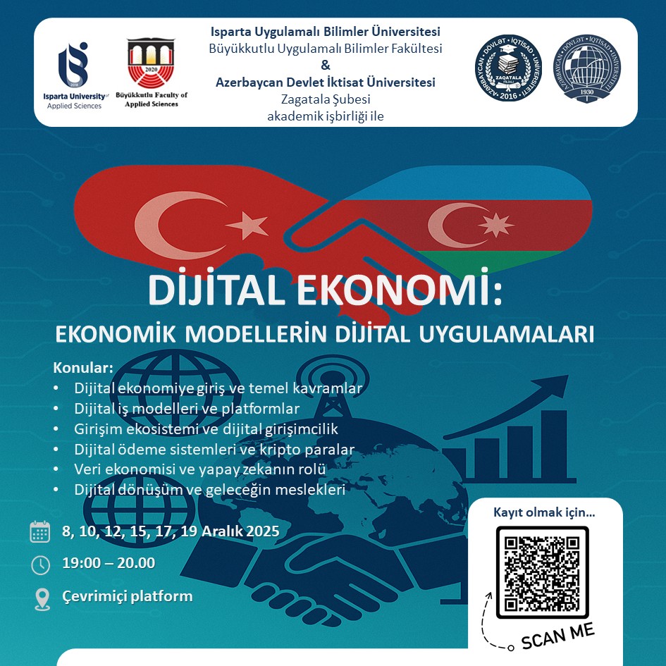 Isparta Uygulamalı Bilimler Üniversitesi Büyükkutlu Uygulamalı Bilimler Fakültesi ile Azerbaycan Devlet İktisat Üniversitesi (UNEC) Zagatala Şubesi arasında yürütülen akademik iş birliği çerçevesinde, öğrencilerimize yönelik “Dijital Ekonomi: Ekonomik Modellerin Dijital Uygulamaları” başlıklı ücretsiz ve çevrimiçi bir e-sertifika programı düzenlenecektir.