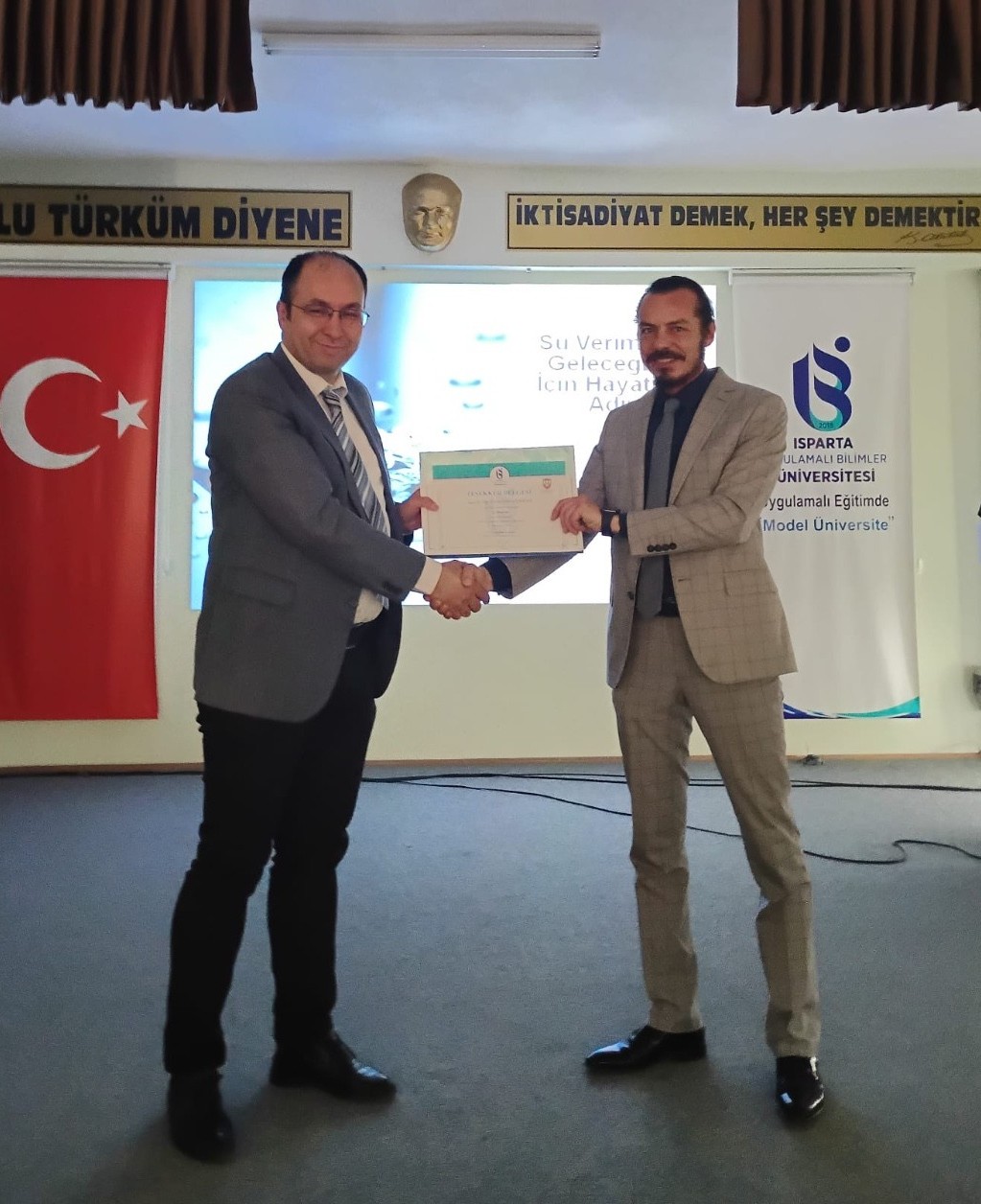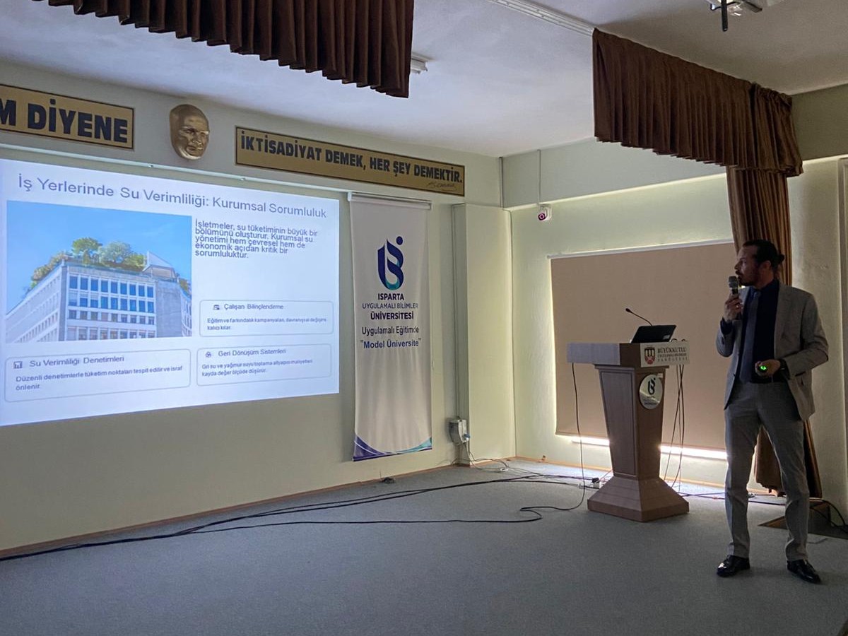 Isparta Uygulamalı Bilimler Üniversitesi Büyükkutlu Uygulamalı Bilimler Fakültesi bünyesinde Dr. Öğr. Üyesi Ömer Erdoğan tarafından gerçekleştirilen "Su Verimliliği" temalı konferansta, suyun dünden bugüne değişen yönetimi ve stratejik önemi kapsamlı bir şekilde ele alındı. "Su Verimli Gelecek İçin Haydi Adım At" sloganıyla gerçekleştirilen etkinlikte, artan nüfus ve iklim değişikliğiyle birlikte beklenen su kıtlığı tehlikesine dikkat çekilirken; hem kamu kurumlarında hem de özel hayatta suyun tasarruflu kullanımının bir tercih değil, kurumsal ve bireysel bir sorumluluk olduğu vurgulandı. Özellikle binalarda ve iş yerlerinde su verimliliği denetimleri, çalışanların bilinçlendirilmesi, gri suyun yeniden kullanımı ve yağmur suyu toplama sistemleri gibi teknik önlemlerin önemine değinen Erdoğan, "Azalt, Yeniden Kullan, Değiştir" stratejilerinin hayata geçirilmesinin gelecekteki su krizlerini önlemede anahtar rol oynayacağını belirtti. Yoğun katılımla gerçekleşen konferans, suyun verimli kullanımı konusunda toplumsal farkındalığın artırılması gerektiği mesajıyla ve teşekkür belgesi takdimiyle sona erdi.