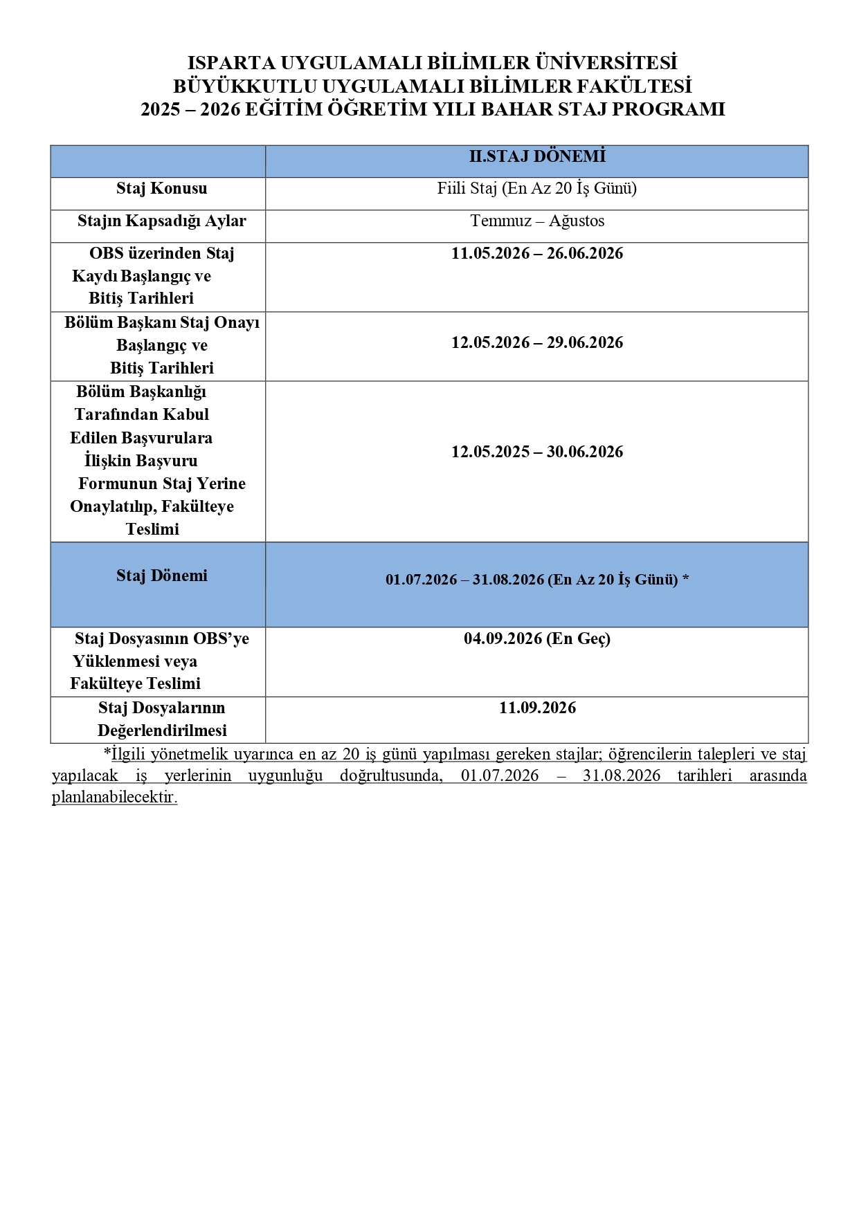 Üniversitemizin eğitim-öğretim müfredatının ayrılmaz bir parçası olan ve öğrencilerimizin teorik birikimlerini sektörel pratikle harmanlamalarına olanak tanıyan 2025-2026 Akademik Yılı Bahar Dönemi Staj Programı’na ilişkin uygulama takvimi ve esasları belirlenmiştir.