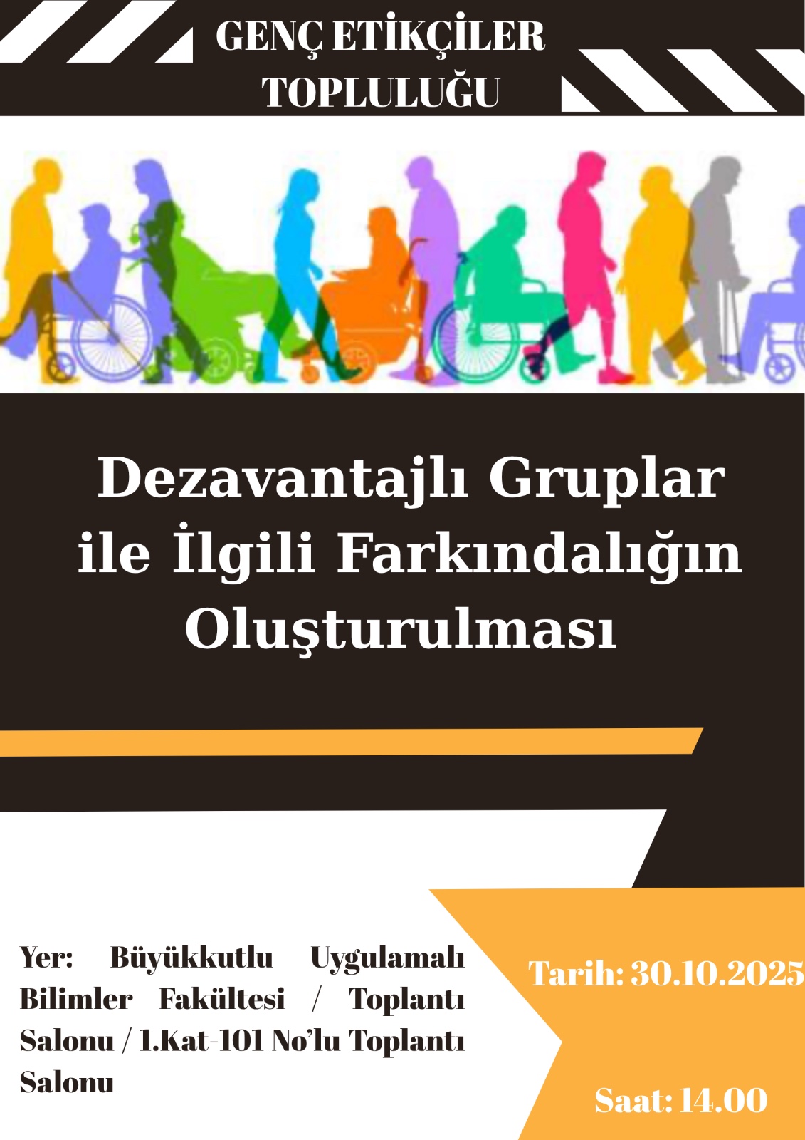 Fakültemiz Uluslararası Ticaret ve İşletmecilik Bölümü bünyesinde kurulan Genç Etikçiler Topluluğu tarafından 30.10.2025 tarihinde, saat 14:00'da Büyükkutlu Uygulamalı Bilimler Fakültesi 1. Kat 101 No'lu Toplantı Salonunda "Dezavantajlı Gruplar İle İlgili Farkındalığın Oluşturulması" başlıklı etkinlik gerçekleştirilecektir. Etkinliğin temel amacı, dezavantajlı grupların toplumsal yaşamda karşılaştıkları engellere dikkat çekmek, bu grupların haklarına ilişkin farkındalığı artırmak ve bireylerin sosyal sorumluluk bilincini güçlendirmektir.