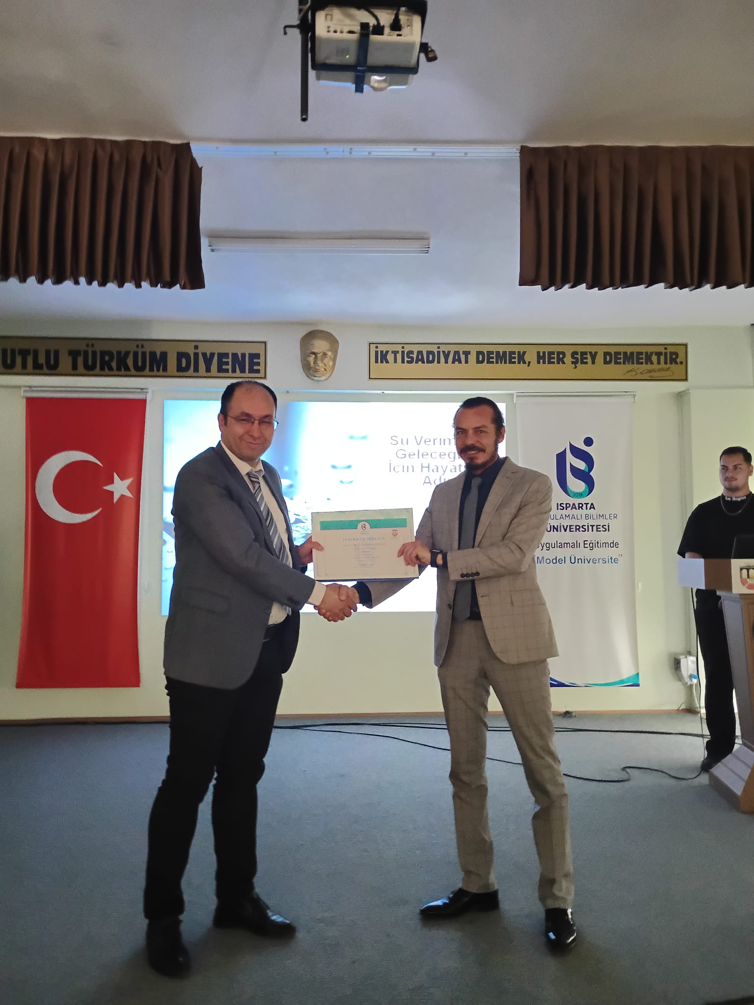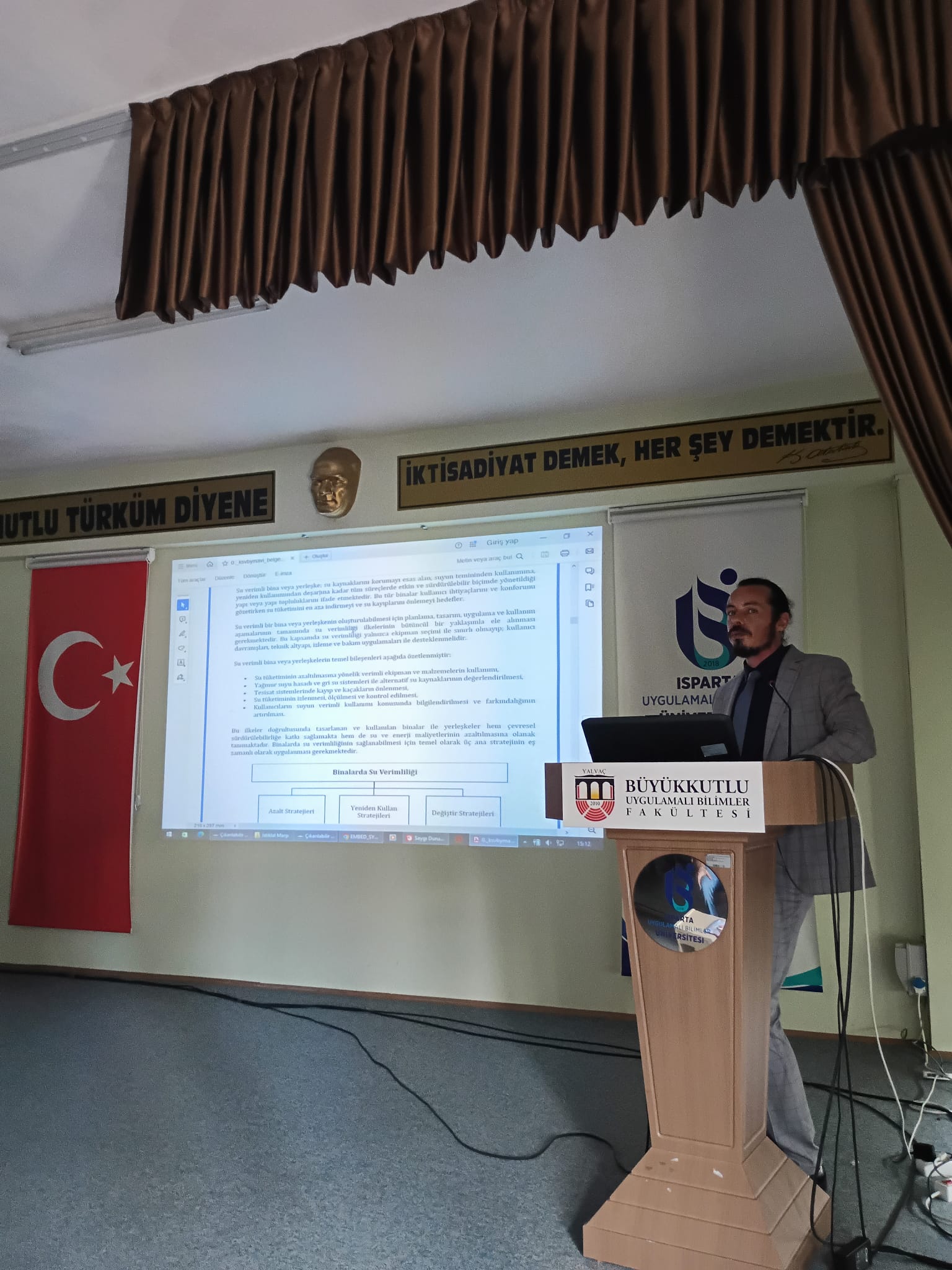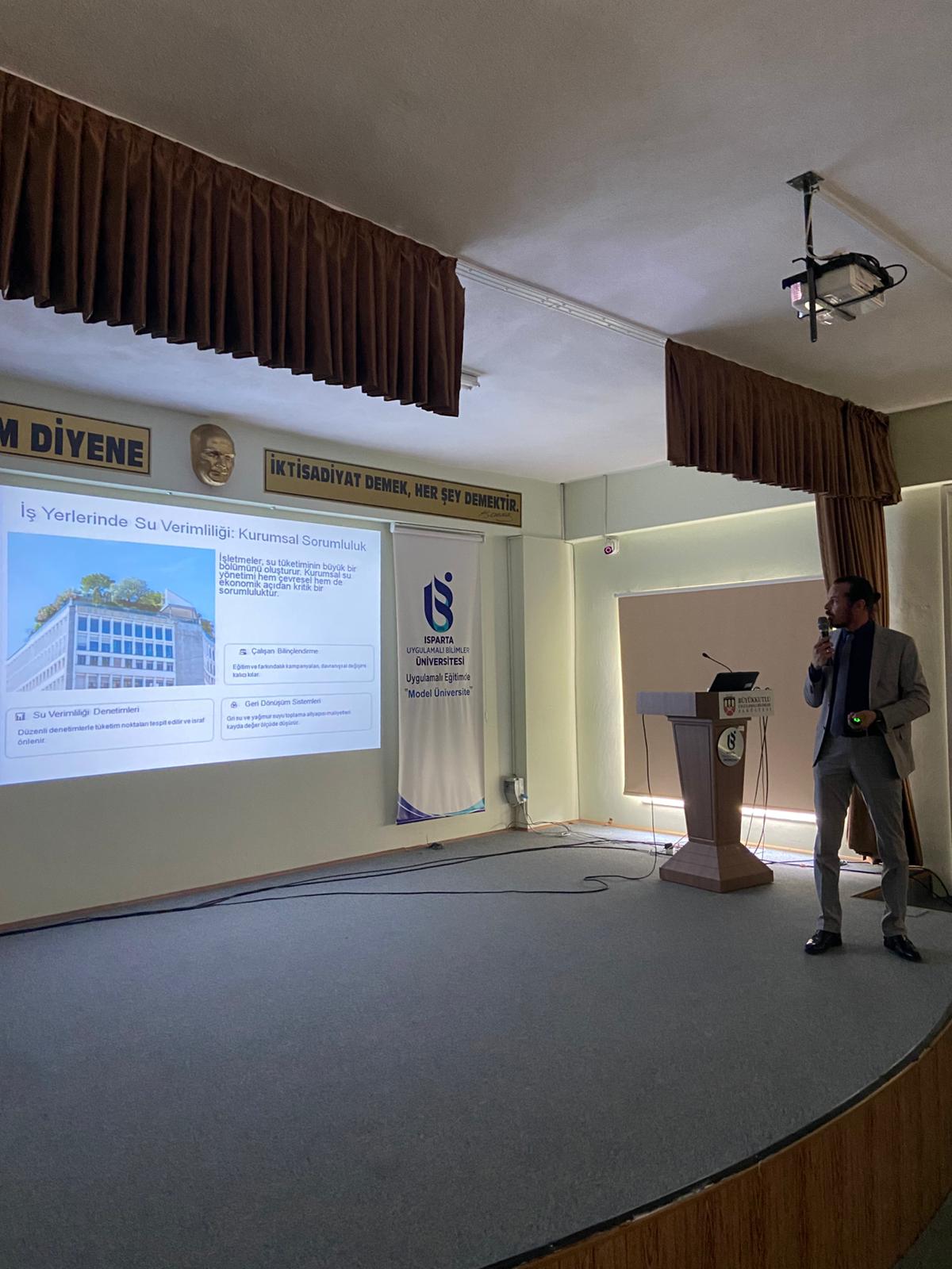 Isparta Uygulamalı Bilimler Üniversitesi Büyükkutlu Uygulamalı Bilimler Fakültesi bünyesinde Dr. Öğr. Üyesi Ömer Erdoğan tarafından gerçekleştirilen "Su Verimliliği" temalı konferansta, suyun dünden bugüne değişen yönetimi ve stratejik önemi kapsamlı bir şekilde ele alındı. "Su Verimli Gelecek İçin Haydi Adım At" sloganıyla gerçekleştirilen etkinlikte, artan nüfus ve iklim değişikliğiyle birlikte beklenen su kıtlığı tehlikesine dikkat çekilirken; hem kamu kurumlarında hem de özel hayatta suyun tasarruflu kullanımının bir tercih değil, kurumsal ve bireysel bir sorumluluk olduğu vurgulandı. Özellikle binalarda ve iş yerlerinde su verimliliği denetimleri, çalışanların bilinçlendirilmesi, gri suyun yeniden kullanımı ve yağmur suyu toplama sistemleri gibi teknik önlemlerin önemine değinen Erdoğan, "Azalt, Yeniden Kullan, Değiştir" stratejilerinin hayata geçirilmesinin gelecekteki su krizlerini önlemede anahtar rol oynayacağını belirtti. Yoğun katılımla gerçekleşen konferans, suyun verimli kullanımı konusunda toplumsal farkındalığın artırılması gerektiği mesajıyla ve teşekkür belgesi takdimiyle sona erdi.